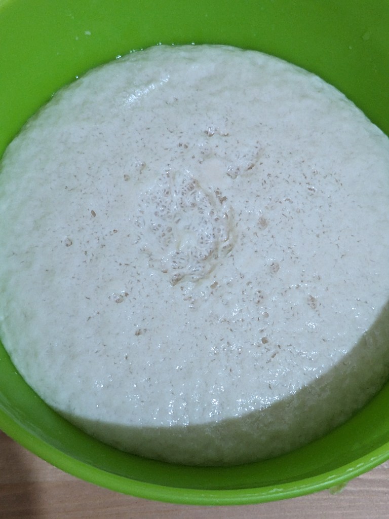 Cover it with wet muslin cloth (not touching to the dough) or with a transparent packing cover. After 4 hours, the dough should raise 2 times more and contract when pushed, as shown below.